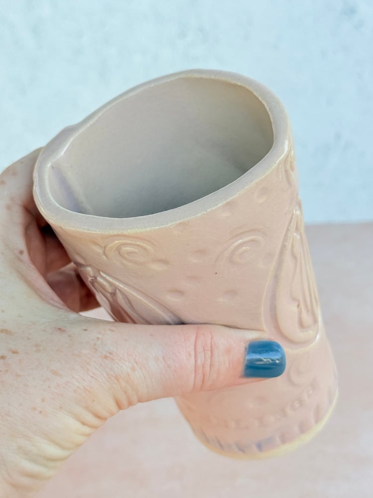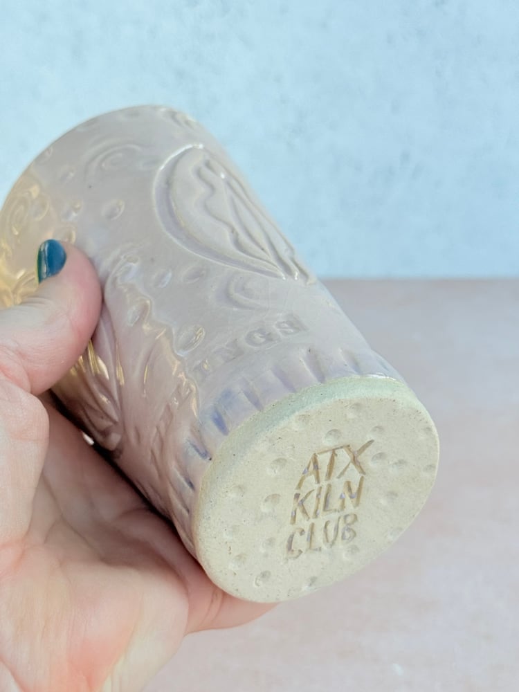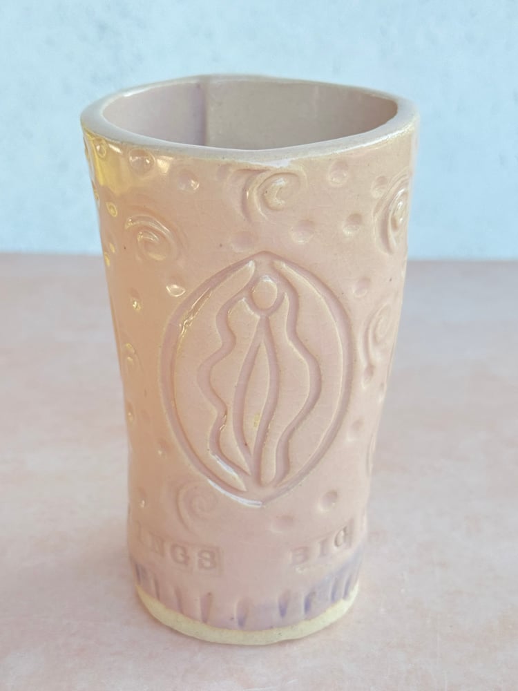 Slab built cup detailed with handmade stamps of vulvas, monsters, and big feelings. Glazed in a glossy pink.