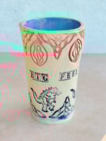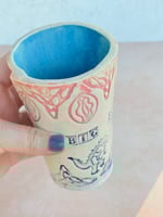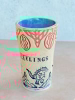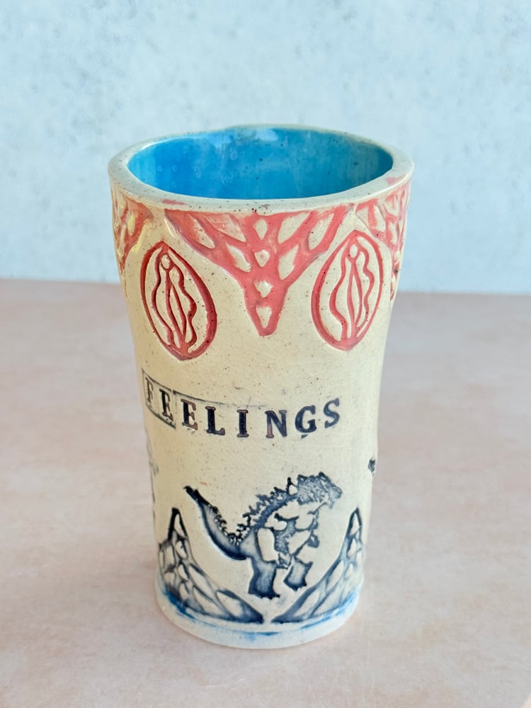 Slab built cup detailed with handmade stamps of vulvas, monsters, and big feelings. Glazed outside in cobalt and pink underglazes and transparent gloss. The inside is glazed in a bright matte blue.