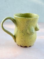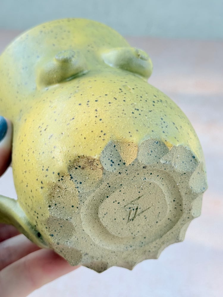 Wheel thrown stoneware mug with hand sculpted elements. Glazed in a matte yellow.