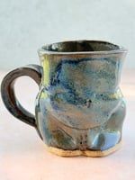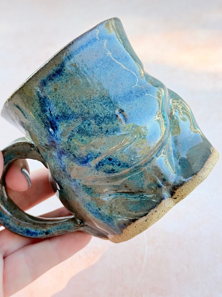 Slab stoneware mug with hand sculpted elements. Glazed in a deep, glossy blue with specks of brown.