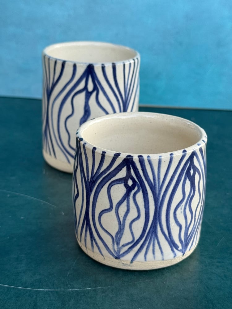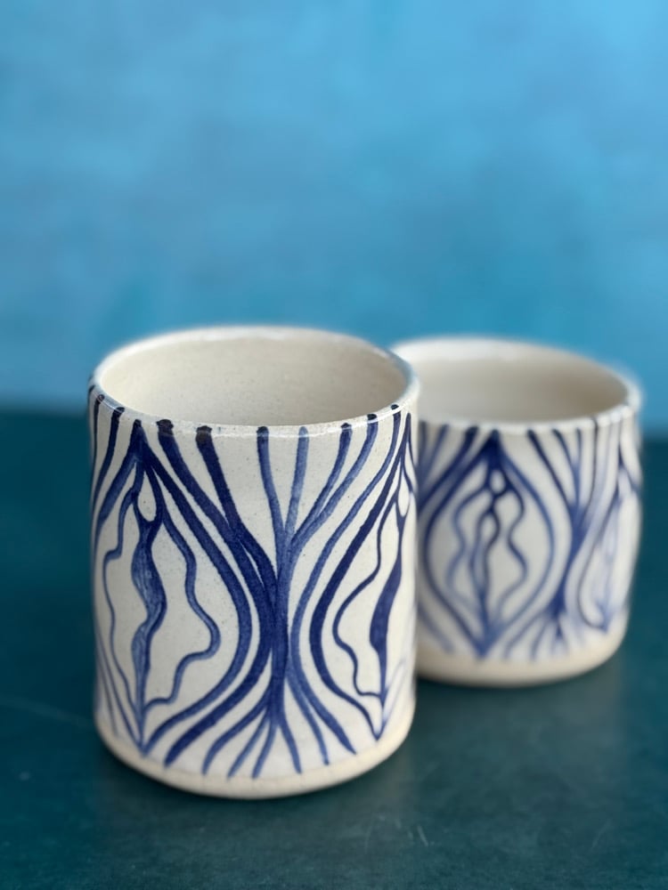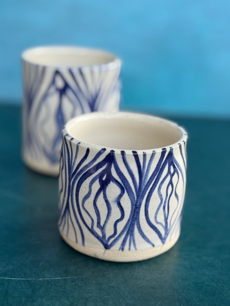 Wheel thrown stoneware cups glazed in a glossy white and hand painted with cobalt stain. (Set of two cups).