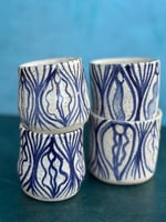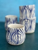 Wheel thrown stoneware cups glazed in a glossy white and hand painted with cobalt stain. (Set of four cups).
