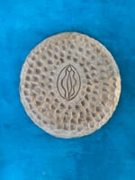Slab built stoneware dish. The interior is glazed in a thick white layer of slip and topped with white gloss. Illustrated with hand painted yoni in cobalt stain. The bottom of the dish is detailed with handmade stamps and hand carved details.