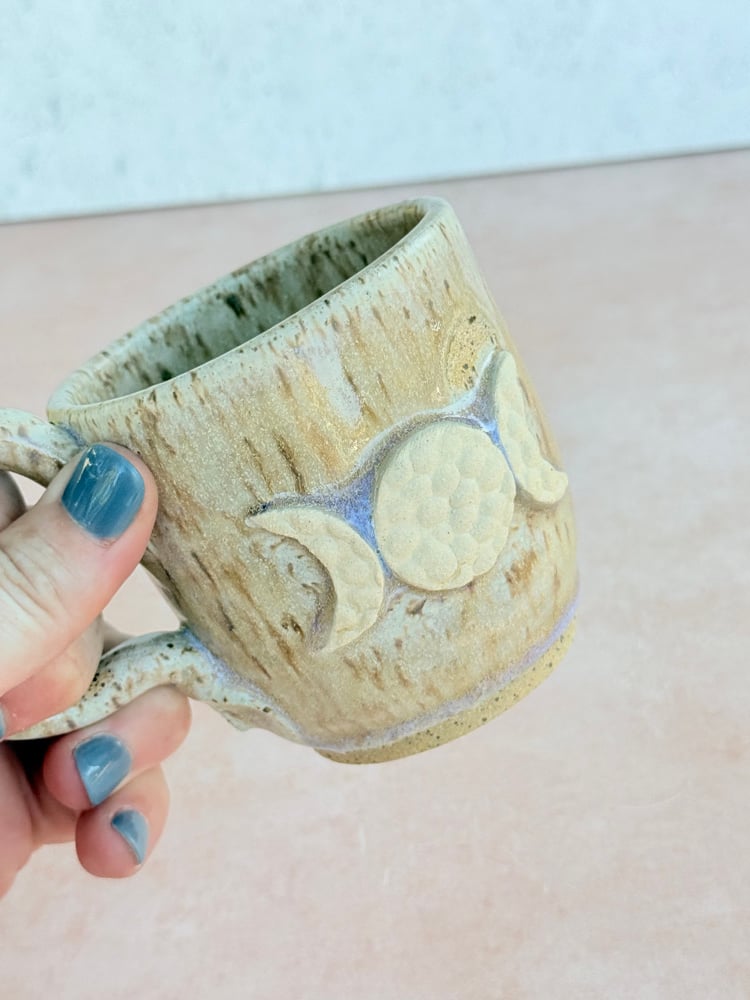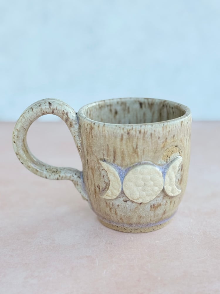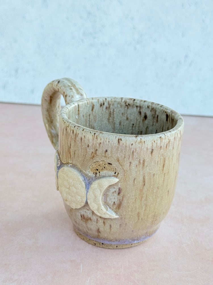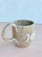 Wheel thrown stoneware mug with hand sculpted moon elements. Glazed in a creamy white glaze with hints of warm pinks and purples.