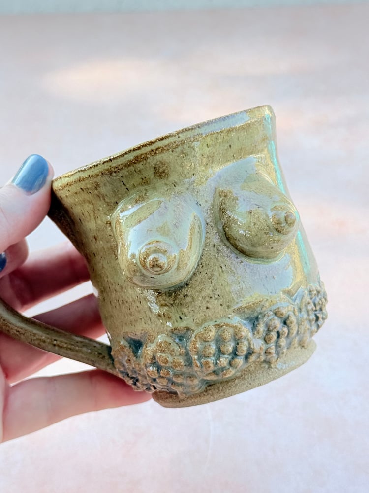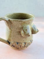 Wheel thrown stoneware mug with hand sculpted elements. Glazed in a sheer gloss with bits of mustard yellow and golden brown.