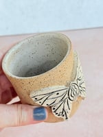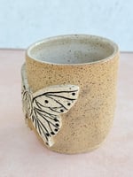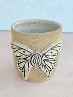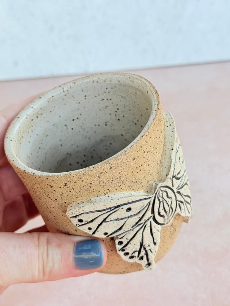 Wheel thrown stoneware mug with hand carved elements. Glazed in a combination of bare clay, black oxide wash, and glossy sheet white.