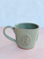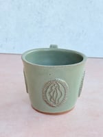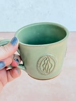 Wheel thrown stoneware mug with hand carved elements. Glazed in a matte green with brown details.